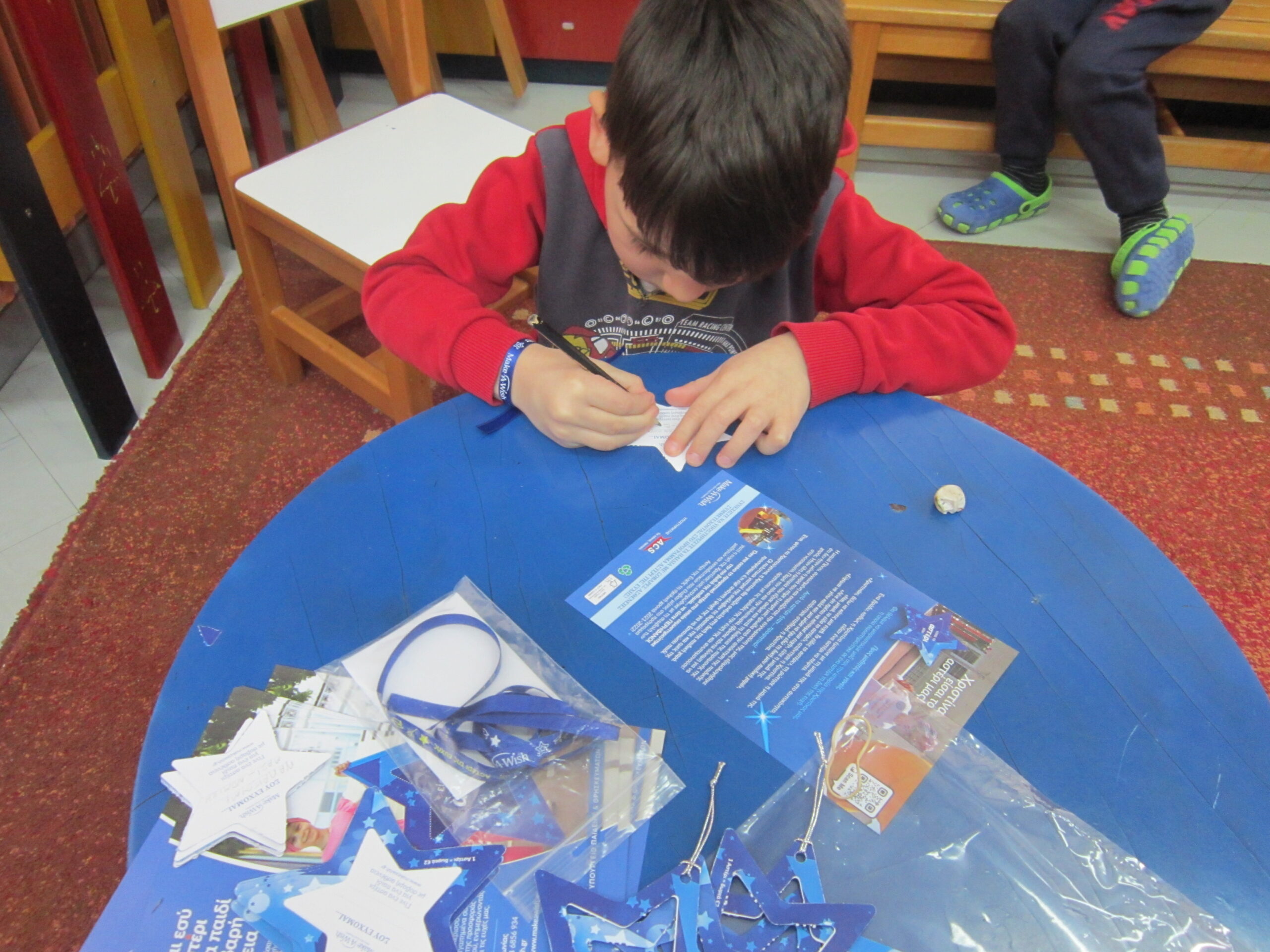 Είδαμε βιντεάκια με ιστορίες παιδιών, συζητήσαμε, εκφράσαμε συναισθήματα και τέλος γράψαμε τις δικές μας ευχές και τις στείλαμε στα παιδιά της Ευχής. Κάθε αστέρι είχε κι ένα ξεχωριστό μήνυμα αγάπης και αλληλεγγύης. Τέλος, φορέσαμε όλοι στο χέρι μας το υφασμάτινο βραχιολάκι του «Make Α wish», περήφανοι για τη δική μας μικρή συνεισφορά…