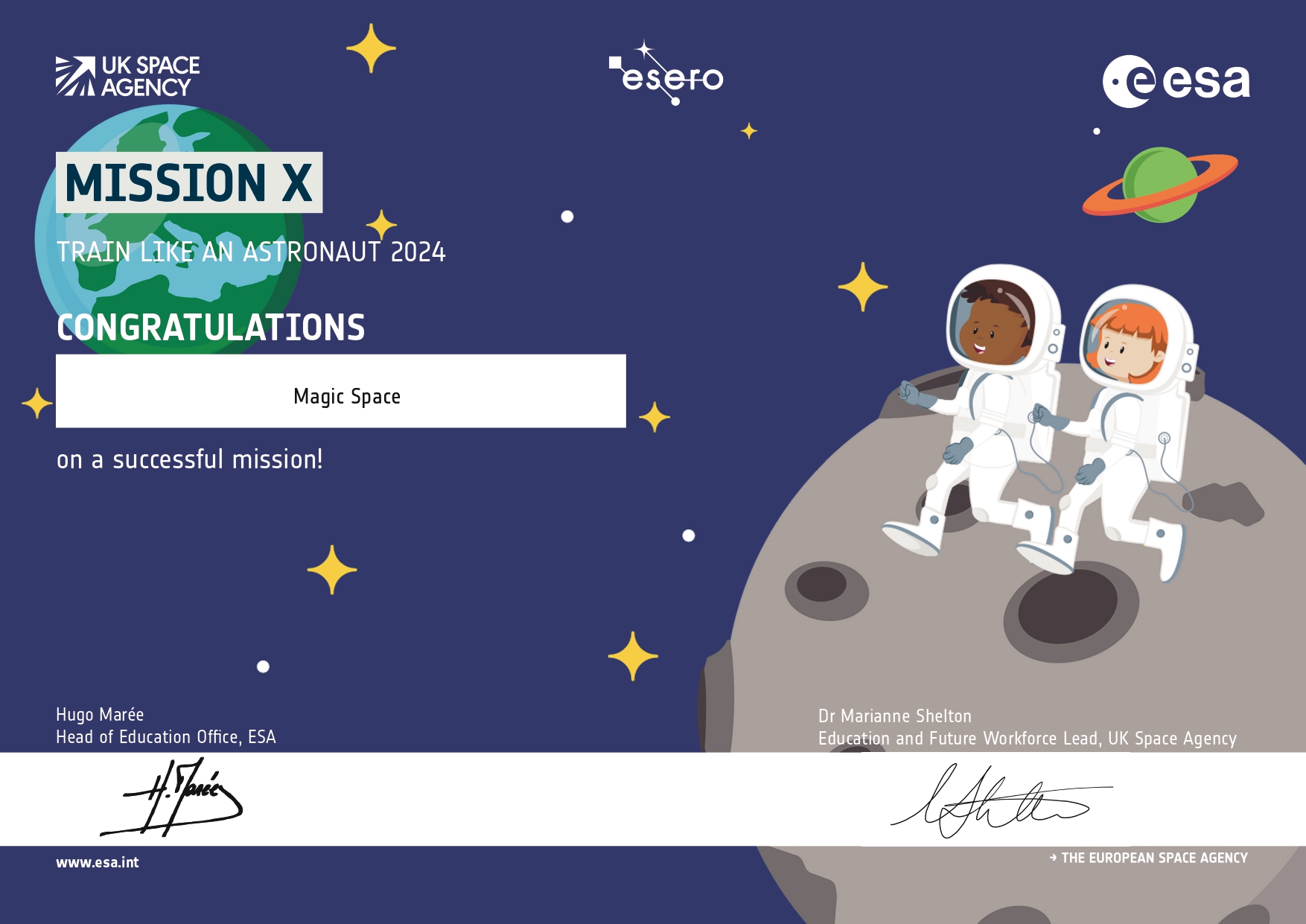 Κατά τη διάρκεια της Aποστολής Χ, ομάδες παιδιών από όλο τον κόσμο ολοκληρώνουν τις δραστηριότητές τους και τις υποβάλλουν για να κερδίσουν βαθμούς. Τα βήματα που κερδίζουν όλες οι συμμετέχουσες ομάδες βοηθούν τις μασκότ της Αποστολής Χ, τη Luna και τον Leo, να διανύσουν 384 400 χιλιόμετρα – την απόσταση από τη Γη στη Σελήνη. Η ομάδα του Νηπιαγωγείου μας με το όνομα Magic Space έβαλε τα δυνατά της…