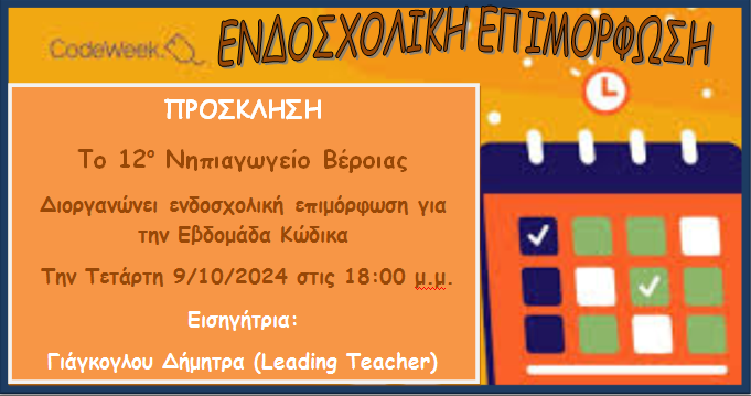 - «Code Week 2024 : Δραστηριότητες Προγραμματισμού με και χωρίς τη χρήση διαδικτύου» (4/10/2024)