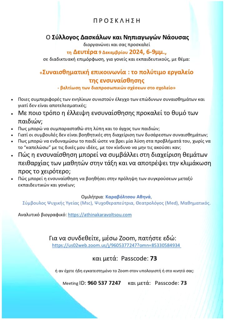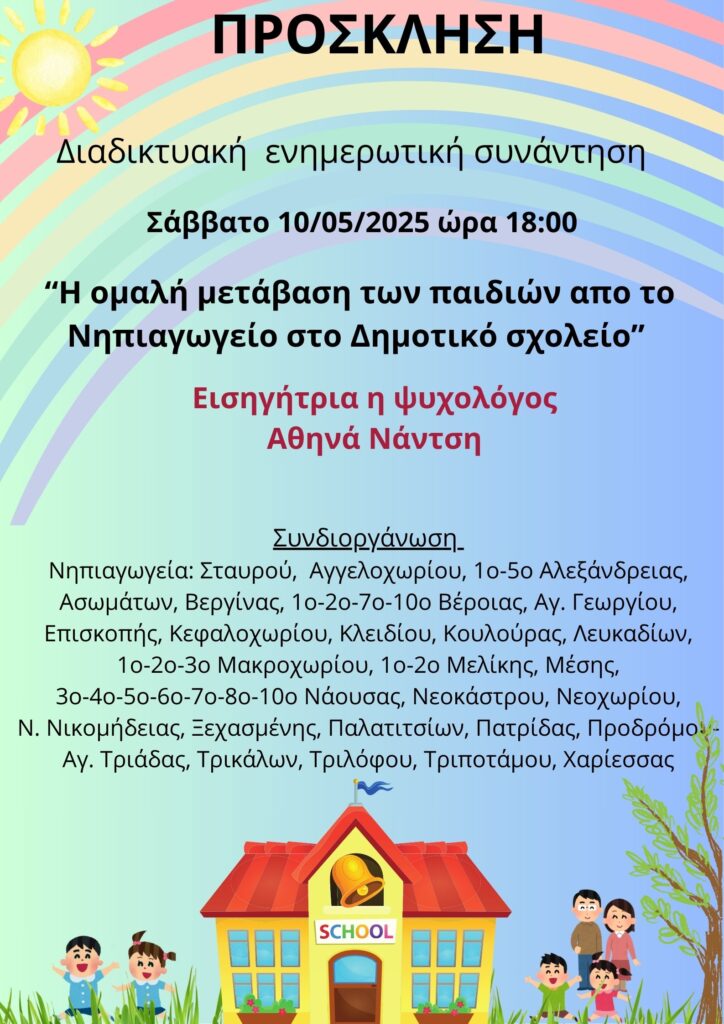 - Ενημερωτική διαδικτυακή συνάντηση γονέων και εκπαιδευτικών με θέμα: “Η Ομαλή μετάβαση των παιδιών από το Νηπιαγωγείο στο Δημοτικό σχολείο”