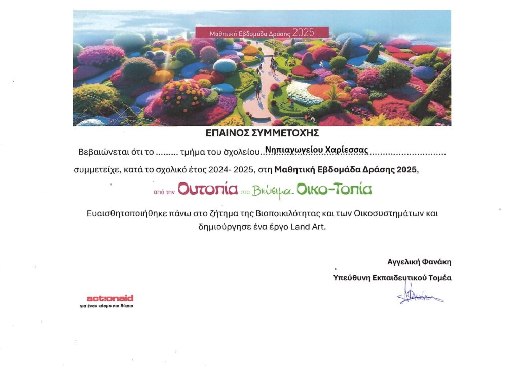 Τα παιδιά ενημερώθηκαν και ευαισθητοποιήθηκαν για το θέμα της φετινής εβδομάδας δράσης αξιοποιώντας το υλικό της ActionAid. Στη συνέχεια δημιούργησαν ένα έργο Land Art στην αυλή του σχολείου μας, χρησιμοποιώντας “υλικά” της φύσης που συλλέξανε από την αυλή και τον περίπατό μας στο κοντινό πάρκο.